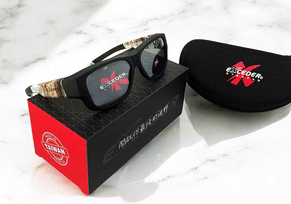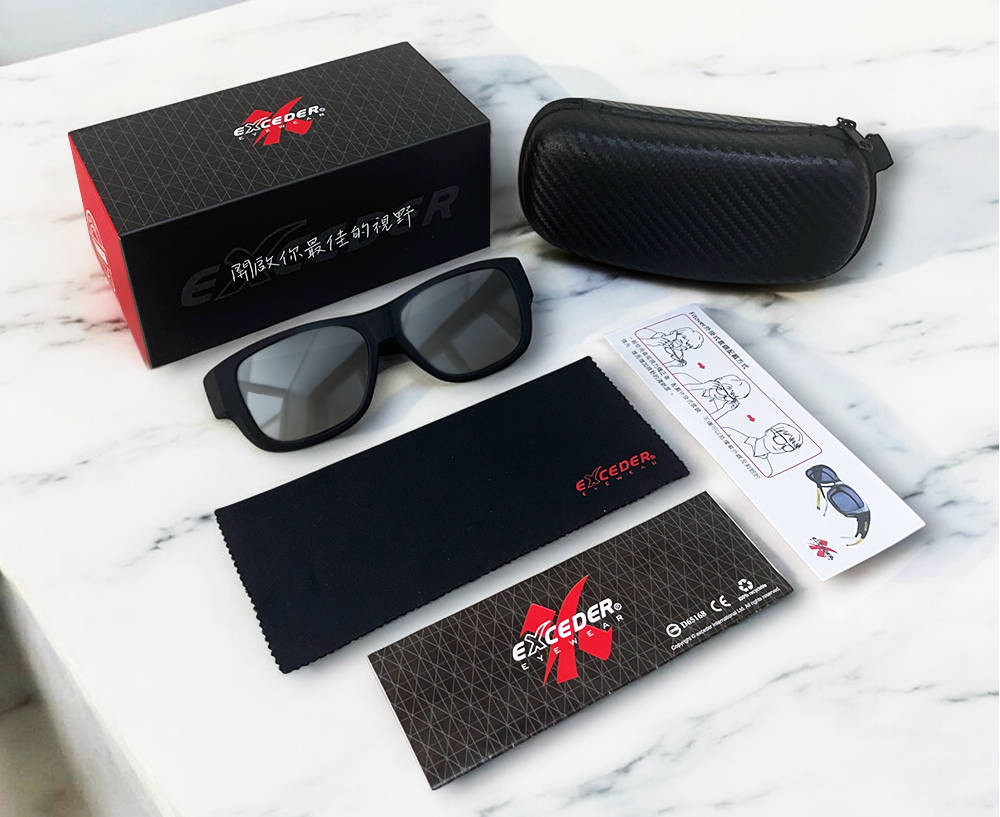 含偏光套鏡、彩盒、仿皮革拉鍊包、眼鏡擦拭布、眼鏡保養及配戴說明書